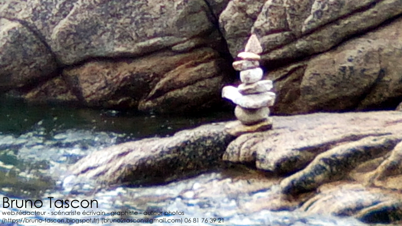 Offertes gratuitement au regard du promeneur déambulant sur cette portion de la côte Bretonne, située à l'embouchure de la rade de Lorient, en face de l'île de Groix (Morbihan Sud), les pierres de ce modeste cairn partiellement immergé par la marée haute ont une vague ressemblance avec la "Petite Sirène de Copenhague" et la "Vénus de Lespugue".